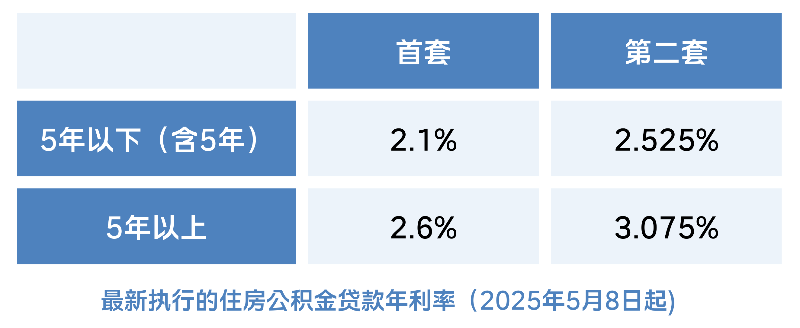 最新执行的住房公积金贷款年利率(2025年5月8日起)