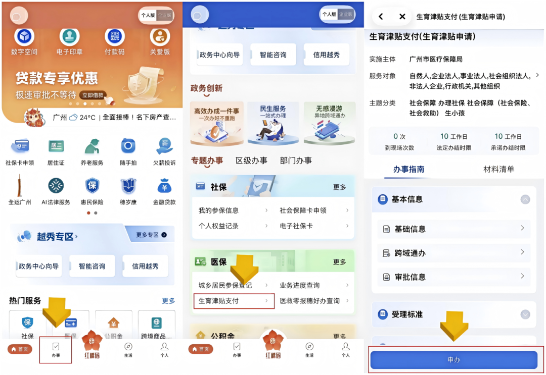 步骤二:从首页“热门服务”进入“医保”,点击“生育津贴支付”,点击“申办”。