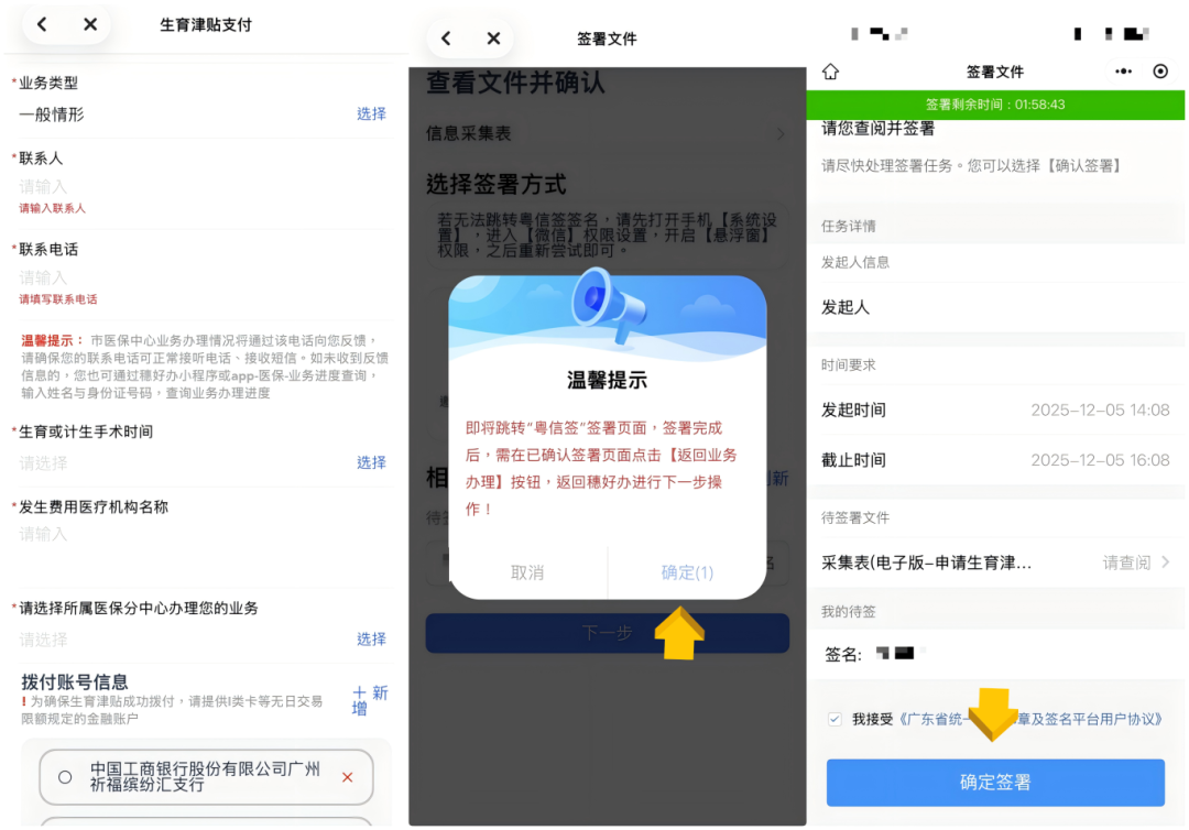 步骤三:根据指引填写相关信息,点击“确认”跳转到“粤信签”签署,填好后点击“确定签署”,根据指引进行人脸验证。