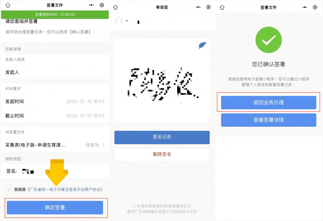 首次使用粤信签小程序签署电子签名的参保人,如完成签名后未出现“返回业务办理”按钮,可手动退出粤信签小程序后,点击穗好办APP进入业务申办界面继续办理业务。
