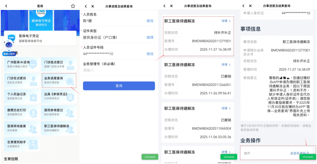 当您收到广州医保发送的补齐补正业务短信通知后,请在3天内(不含当日)通过穗好办APP“医保-业务进度查询”或“个人-我的办事”入口补充上传材料,推荐使用“医保-业务进度查询”。界面清晰、指引明确,一键即可完成补交,您也可在穗好办APP申请医保业务后定期前往“医保-业务进度查询”界面查询是否有待补齐补正业务。