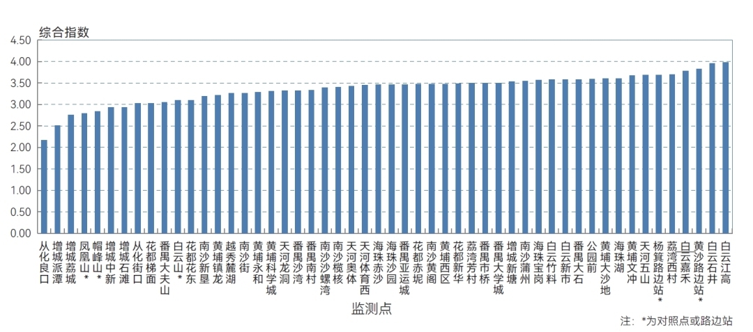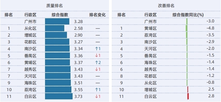 从各区情况看,环境空气质量综合指数排名前三位为从化、增城、花都区,后三位为白云、荔湾、海珠区;白云、增城区空气质量同比变差,其余各区同比均改善,黄埔、荔湾、南沙区同比改善幅度较大。此外,全市设有52个市控以上空气质量监测点,其中,空气质量最好的前三个点位是:从化良口、增城派潭、增城荔城;空气质量最差的三个点位则为:白云江高、白云石井、白云嘉禾。