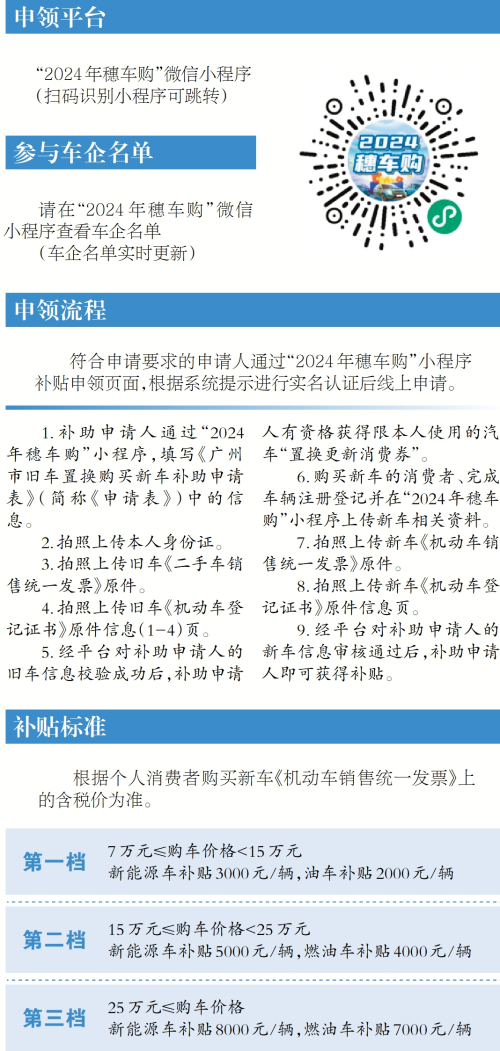 据介绍,活动时间为2024年5月1日至2024年12月31日,补贴活动期间,个人消费者通过将本人名下在广州市注册登记的小客车进行“置换更新”的方式,在依法登记注册并在广州从事汽车销售经营的企业购买新能源车、符合国六排放标准的燃油车,且在广州市完成新车注册登记的,可申请置换更新消费券补贴。