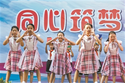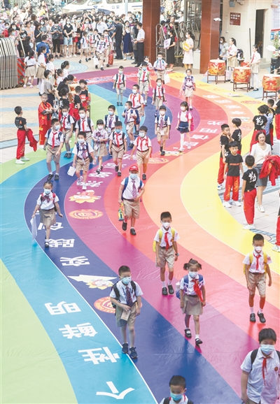 9月1日上午,广州天河区华阳小学的同学们一走到校门,就发现了惊喜:一条绚烂的七彩路,从校门口一直延伸到了教学楼。校长周洁告诉记者,七种颜色代表了华阳小学的七个育人目标,希望孩子们都能成为乐学善思、个性鲜明、实践创新、热爱运动、自信阳光、享受阅读、文明有礼的“太阳娃”。七彩路两边,还有街舞队和锣鼓队的同学们在表演,老师们举着“好想你”“欢迎你”等手牌,一脸笑意地迎接同学们。