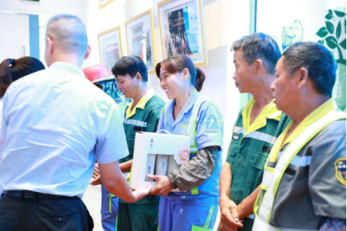 活动现场邀请了10名环卫工人分享了他们对垃圾分类的心得体会,街道领导和爱心企业为他们送上了暖心礼物,以此表达深深的谢意和崇高的敬意。