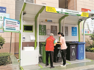 记者走访发现,该社区在生活垃圾定时投放点配置了崭新的垃圾分类投放亭,亭内装有多个摄像头和感应器,对居民投放垃圾的情况进行实时记录。此外,这里还配置了洗手池、洗手液、干手器等便民设施及播放垃圾分类小知识的LED显示屏。