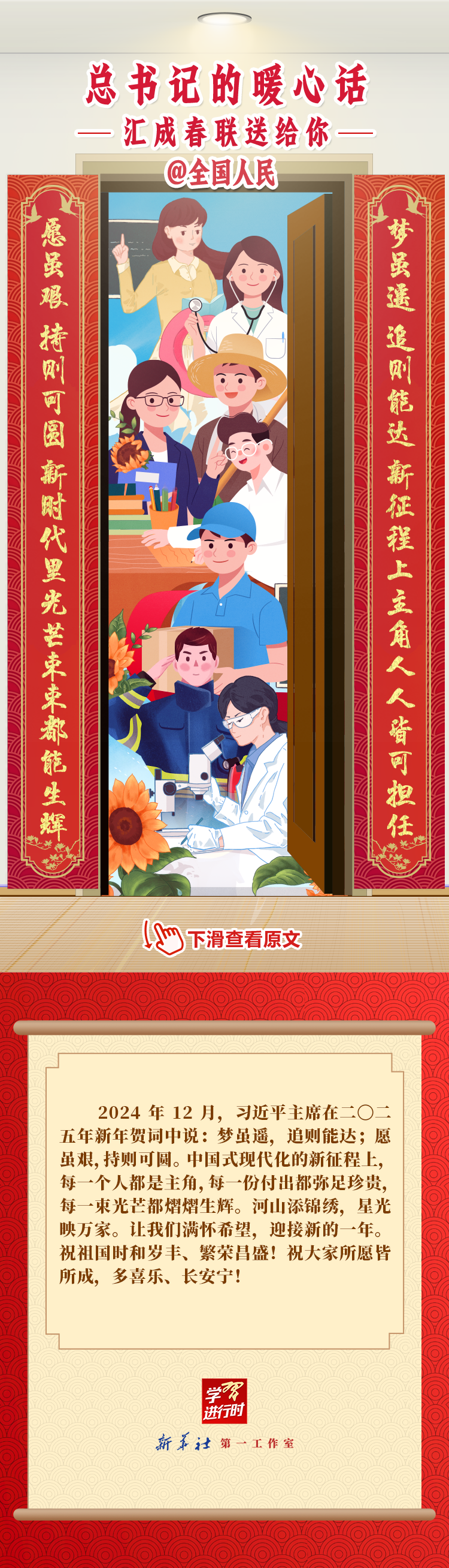过春节,贴春联,寄托人们对新年的美好愿望。过去一年,习近平总书记在不同场合点赞各行各业奋斗者,说了许多暖心话。新春之际,我们汇编成联,向新征程上的每一位“主角”致敬,送上新春的祝福。