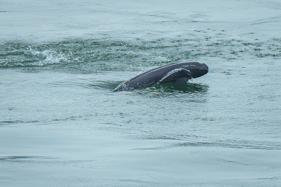 长江江豚在湖北省宜昌市葛洲坝下游水域逐浪嬉戏(2024年5月21日摄)。