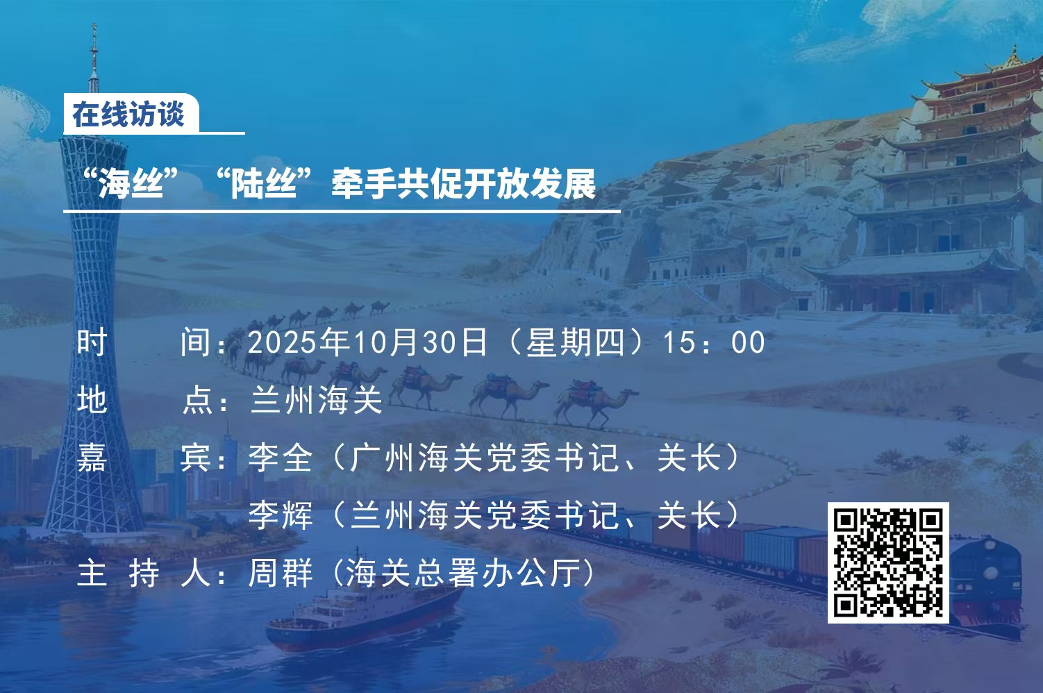 据广州海关消息,该关联合兰州海关将于10月30日(星期四)下午15:00-16:00在中国海关门户网站举行题为““海丝”“陆丝”牵手共促开放发展”的在线访谈。届时,广州海关、兰州海关主要负责同志将参与“在线访谈”并在线回答网友提问。