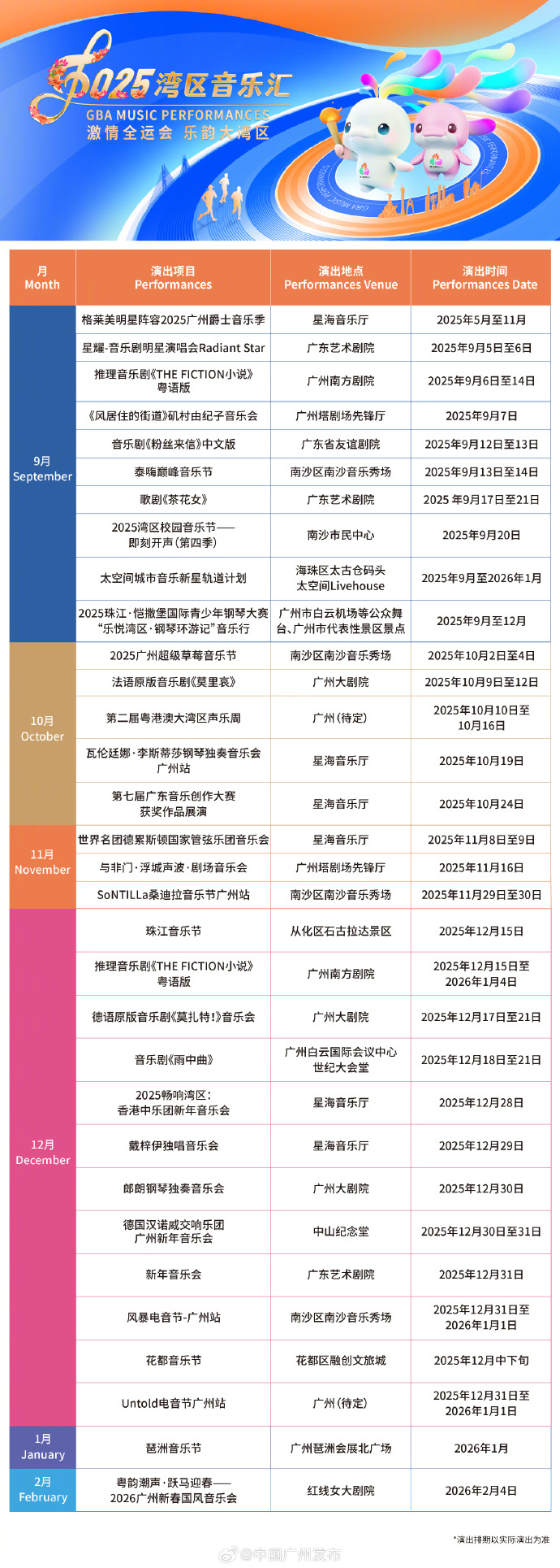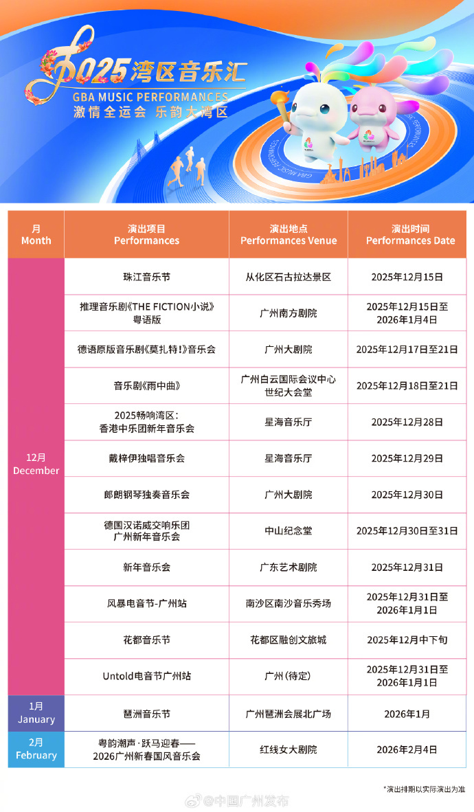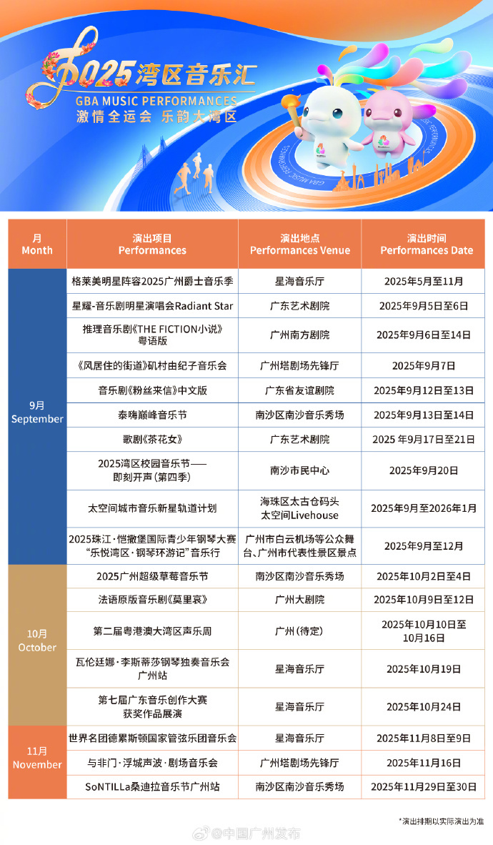 据悉,除开幕大戏《茶花女》之外,本届“湾区音乐汇”还将推出众多亮点活动,持续至年底,涵盖户外音乐节、国际名家名团演出、原创音乐推广和本土音乐传承四大板块,共计130余场演出活动。据悉,今年音乐汇规模进一步扩大,活动覆盖全市11个区,演出场所不仅包括专业剧院,还延伸至南沙、花都、增城等户外场地,着力构建“全域舞台、全时体验”的音乐生态布局。尤为值得一提的是,本次活动与第十五届全运会深度融合,以艺术形式传递体育精神与拼搏激情。届时,来自全球二十多个国家和地区的艺术团体及个人将登台献艺,在展现国际艺术视野的同时,粤语音乐剧、广东民乐等广府特色节目也将集中亮相,进一步促进文旅消费和夜间经济的提质扩容。