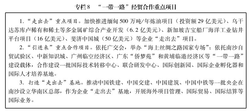 “一带一路”和自贸区战略机遇。国家大力实施“一带一路”和自贸区战略,中国—东盟自贸区升级版、CEPA(内地与港澳关于建立更紧密经贸关系的安排)、中澳自贸区等陆续实施,同时从国家层面提出加快南沙等粤港澳合作平台建设、强化广州国际航空枢纽以及批准设立中国(广东)自由贸易试验区南沙新区片区,为我市打造“一带一路”建设的桥头堡、率先构建开放型经济新体制提供重大契机。