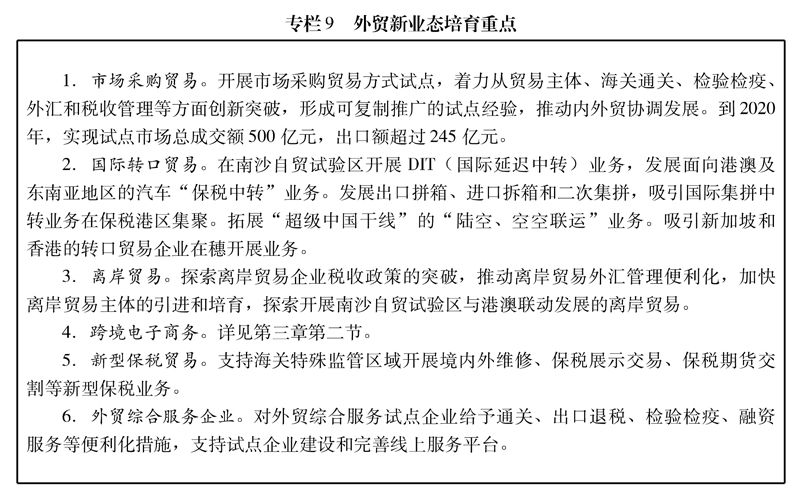 强化国际贸易功能创新集成。积极探索转口贸易、离岸贸易、保税贸易、保税展示、保税期货交割、融资租赁、跨境电子商务、汽车平行进口等新型贸易形态,推动南沙自贸试验区成为国际贸易创新的试验田和国际贸易功能集成区。大力推进南沙跨境贸易电子商务产业园、临港国际大宗商品交易中心、国际采购配送中心、汽车保税中转、进口消费品集散中心、汽车进口口岸暨全球品牌汽车展览中心、海工和重型装备成套供应和出海口基地等项目建设,尽快形成贸易集聚效应和外贸新增长极。促进服务贸易创新发展,培育一批创新发展的服务贸易龙头企业和具备较强竞争力的服务品牌;率先推进与港澳服务贸易自由化,打造成为以穗港澳服务贸易自由化为主导的服务贸易创新发展核心区。