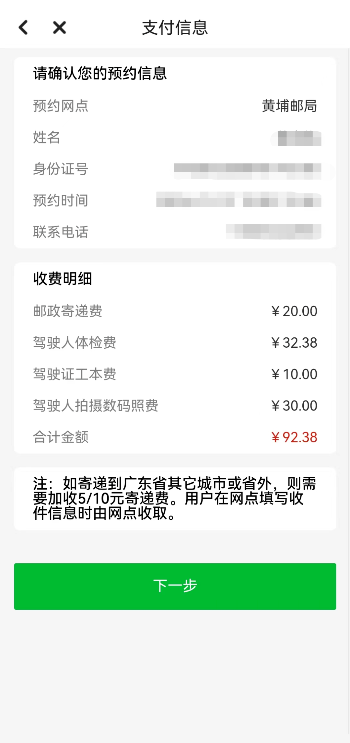 确认预约信息后,需在线支付补换领业务办理费用。预约成功后无需再次在线下支付办理费用。订单成功支付后,如取消订单退款将会在3-5个工作日内原路返回。
