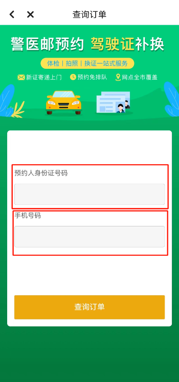 3.查询订单:返回到预约办理首页,点击“驾驶人体检换证订单”,输入证件号和手机号即可进入订单中心查询订单,点击所选订单还可进行修改订单或取消订单操作。
