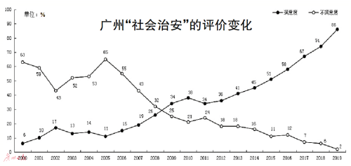 广州社情民意研究中心自1990年起至今,每年都开展“广州城市状况市民评价”追踪调查,并定期开展社会治安的专项调查,至今已经有20多次,调查结果及时反映广州市民的诉求和期待。据广州社情民意研究中心总干事梁幸枝介绍,在20世纪90年代,社会治安是广州市民最关注的社会问题之一,在这个时期,群众安全感尚可,但总体来看,满意度还不太高。进入本世纪后,市民对社会治安的不满意度有所下降。2009年前后,市民评价呈现好转,满意度超过不满意度。在这十年里,广州社情民意研究中心定期开展了社会治安的专项调查,围绕市民“对广州治安的评价”“对警方工作的评价”“安全感状况”以及“受侵害情况”多方面进行社情民意研究。