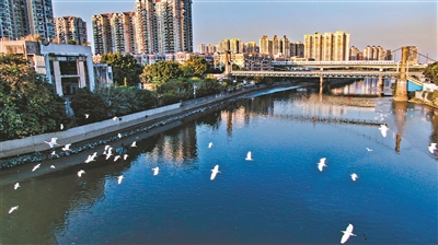 白云区石井河经过治理后水质改善,一群白鹭水中觅食