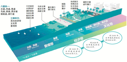 功能复合是碧道的一大特色,规划中提出,以碧道统筹山水林田湖海系统治理,改善流域生态环境、实现空间综合利用、带动产业转型升级、激活片区多元价值。广州市深化细化省万里碧道“三道一带”空间要求,提出“水道、风道、鱼道、鸟道、游道、漫步道、缓跑道、骑行道”八道合一和“滨水经济带、文化带、景观带”三带并行的“八道三带”空间范式,保护珠江生态岛链、建设碧道风廊、水鸟走廊,恢复鱼类洄游生态圈,打造蓝线上的公共服务综合带,实现堤内外、上下游、干支流、左右岸系统治理,形成广东碧道建设的“广州方案”。