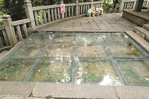 在前期浴日亭明代地面的防护中,为防止外界侵扰,采用了全封闭的防护措施。此次整治,工程人员改换成半封闭式结构的不锈钢框,有效改善了框内的通风环境,降低湿度,同时,可随时清除内生杂草,减少了水分和植被对地面红砂岩的侵害。
