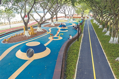 带孩子在碧道上玩耍的刘女士告诉记者:“这里的环境好,空气好,交通又方便。有轨电车就在旁边,还能晒到太阳,比室内的游乐园更适合孩子。”注重品质与细节也是广州碧道建设的特色,记者看到,游乐园里的“沙池”铺的不是沙子而是小块的树皮,设计人员告诉记者:“使用小块树皮避免了孩子玩耍时,鞋子总会进沙的情况,而且树皮也更柔软,对孩子更安全。”