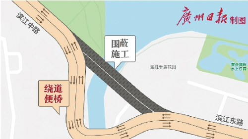 按照设想,便桥建成后,滨江东路从西往东方向的车流将先向南改道怡海路,在仲恺路和怡海路的交会处接驳上临时便桥,然后经怡乐路口往东接上滨江东路。怡乐路口的绕行路线将根据拆迁和建设进度分期进行调整。