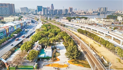 橙色的金盏菊、玫红的牵牛花、青绿的草皮……走出坦尾地铁站,人们印象中那个乌糟糟的地铁桥底换上新颜,色彩斑斓的景观带点亮大坦沙“门户”,让人心旷神怡。就连地铁高架桥、市政路桥、铁路桥下的“灰空间”也种上绿竹,保持了景观的连续性。