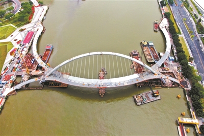 随着最后一根钢梁支架顺利拆除,备受关注的广州首条珠江两岸人行桥即将建成。目前,桥梁主体已经建成,桥身的横拉索也全部挂上,桥梁的形态基本展示。高耸的桥拱、弧线的造型,仿佛一道彩虹跨过珠江。
