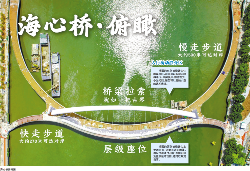 “以前没有桥的时候,到对岸需要乘船不方便;后来有了广州大桥,人车通行,桥上行人会闻到汽车的尾气;而有了人行桥之后,站在桥上会感觉空气很好;所以海心桥既是疏导交通的桥,又是人文桥,还是艺术桥,更是民心桥。”何镜堂说,之所以说海心桥是民心桥,实际上从桥的坡度到栏杆再到休息区的设计,从人快走或慢走的习惯,均考虑到以人为本。