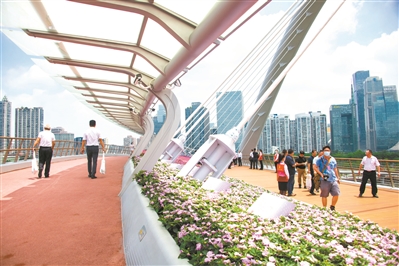 花城处处飘香,在人行桥上同样看到鲜花朵朵,在入口处、桥中央位置都已经铺种了紫色和红色的千日红,与棕榈色的地板,色调和谐一致。连日来,来自中铁广州工程局的建设工人对桥面附属设施做最后的施工和调整,确保桥梁每一个细节都完美呈现。