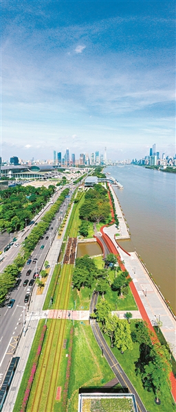 在海珠区阅江路碧道,孩子们在小游乐园里玩耍,年轻人在碧道上跑步、骑行,还有人悠闲得在江边钓鱼。阅江路碧道属都市型碧道,西起广州塔,东至琶洲大桥,全长6.6公里,现已全线建成开放。该碧道以“阅江汇客·都市生活”为理念打造全人群的都市亲水生活场景,沿着阅江路碧道向前,一路绿意盎然,抬头望去,琶洲试验区建设热火朝天,一幅现代数字经济与绿色生态交织的画卷正在展开。阿里巴巴、腾讯、TCL、三一重工、唯品会、科大讯飞……一幢幢大楼如雨后春笋般涌现。