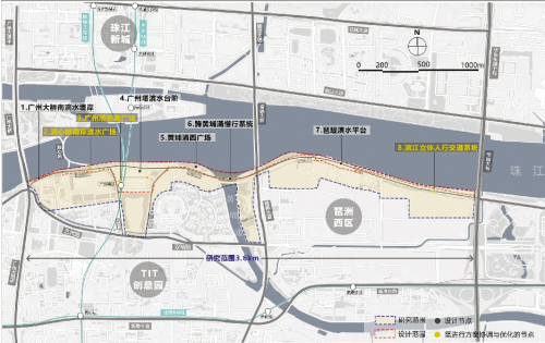 该竞赛研究范围位于广州大桥至华南快速3.6公里滨江段及其纵深腹地,面积约87.5公顷,设计范围位于广州大桥至华南快速3.6公里滨江段,面积约27.5公顷。经过前期调研、科学研判和专家论证,此次竞赛重点选取广州大桥南滨水堤岸、广州塔滨水台阶、黄埔涌西广场、跨黄埔涌慢行系统、琶醍滨水平台等5个设计节点,针对相关节点存在的服务功能相对缺乏、空间开敞度不够、空间品质有待提升、慢行道不够畅通等问题进行优化设计。