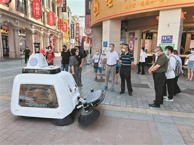 近日,在荔湾区上下九步行街,一场特殊的“人机对战”比赛正在上演。原来,荔湾区城管部门在上下九步行街启用了一台无人驾驶清扫车,正在限定区域内,测试这位“环卫机器人”和环卫工人到底谁扫得快。开局仅几分钟,“环卫机器人”就把环卫工人远远甩在身后,扫过的地面干净整洁。围观市民张先生感叹:“没想到机器人清扫效率这么高,太快了!”