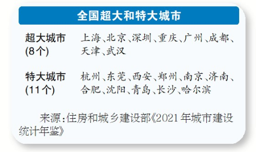 根据国务院于2014年下发的《关于调整城市规模划分标准的通知》,城区常住人口1000万以上的城市为超大城市,城区常住人口500万以上1000万以下的城市为特大城市。根据住房和城乡建设部公布的《2021年城市建设统计年鉴》,截至2021年末,全国共有超大城市8个,分别为上海、北京、深圳、重庆、广州、成都、天津、武汉。全国特大城市11个,分别为杭州、东莞、西安、郑州、南京、济南、合肥、沈阳、青岛、长沙、哈尔滨。