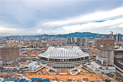 白云站站房总用钢量约为11.8万吨,在全国建筑行业首屈一指,屋盖和104片“花瓣”钢结构共同构成了“云山珠水,盛世花开”的外观造型。记者在现场看到,带有红色渐变飘带的“内花瓣”钢结构已经基本完成,施工单位中铁建工集团正在抓紧组织吊顶铝板和“外花瓣”的安装施工。“广州白云站于2020年10月10日正式开工,分两期进行,高峰作业人员达6000余名。2022年1月6日,二期工程开始施工。2023年6月19日,站房主体结构全面封顶。”中铁建工集团广州白云站项目总工程师刘俊介绍,“广州白云站现已全面进入机电安装及装饰装修阶段,预计在10月初大面积完成装饰装修施工,年底竣工交付。”