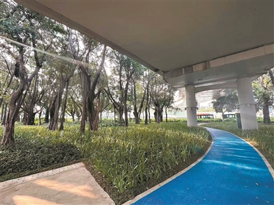 今年以来,黄埔区将桥下空间和桥下绿地进行整合利用、整体改造,因地制宜打造口袋公园,改造提升面积达9500平方米。在绿化品质化提升方面,以保护利用原有树木为基础,补植了桂花等开花乔木,增加植物多样性,提升观赏性,同时对原有的裸土进行复绿,整个地块共铺种草皮约1500平方米,新增红背桂、翠芦莉、鸢尾等地被约6500平方米。