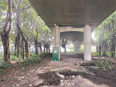 在黄埔东路与开发大道立交桥下,立交桥、匝道桥、跨线桥共同构筑了一处大型的桥下空间。立交桥和匝道桥间有一处面积较大的桥下绿地,因长期利用不足变成“城市边角”地带。桥下空间杂草生长,部分区域光照不足不利于植物生长,长期有泥土裸露。而绿地所处位置距离南岗村2.5公里,周边有新港生活区、夏园村等居住社区,居民群众对城市休闲空间的需求较大,改造迫在眉睫。