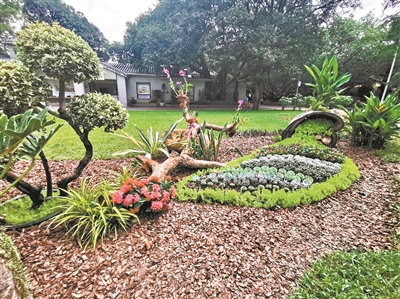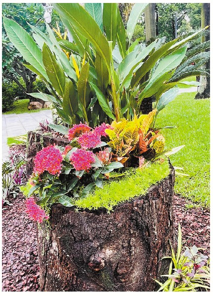 在“枯木逢春”园林小品,园艺师在日常养护中收集的枯树枝上,附种开花的石斛兰,将老化的树木锯成高低、大小不一的空心树桩形状,填入种植土,以树桩代替传统花钵,搭配种植多肉、垂吊、开花植物等,最大程度利用绿化资源,营造出“枯木逢春”的生态野趣,给市民游客带来大自然的惊喜。