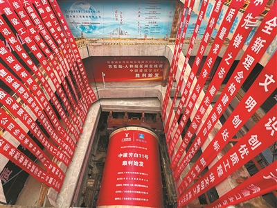 为攻克地质风险,广州地铁联合总承包单位中建股份和施工单位中建三局,对盾构机选型进行针对性设计,采用直排式带螺机泥水盾构机“中建芳白11号”。盾构整机全长142米,开挖直径8.84米,整套机组约1200吨。盾构机强化了逆循环功能,并配备采石箱,更易排出泥水舱内渣土,防止泥饼与滞排现象。