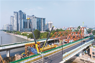 由中铁十二局承建的广湛高铁广佛段站前1标段工程,正线长度7.577公里,联络线线路长度7.802公里,于2023年10月1日启动建设。中铁十二局广湛铁路1标二分部副经理侯赛峰向记者介绍,原珠江东桥钢桁梁架构为五跨,新建高速铁路桥将沿用原桥钢桁架形式,在保持原有历史风貌的基础上,将五跨改为三跨,三跨共包含24段节间,分7轮进行拼装和顶推。“项目部国庆期间不停工,10月6日刚刚进行了首轮两节间钢桁梁的顶推,9日将进入第2轮钢桁梁的拼装,预计本月月底拼装完成,30日进行顶推。”侯赛峰说。