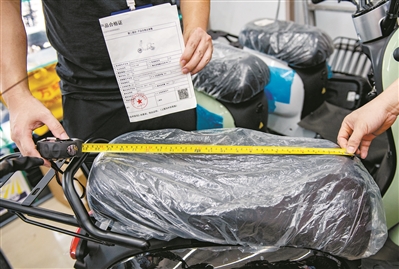 随后,执法人员又“揪”出了一台涉嫌非法改装的车辆。根据国家标准规定,电动自行车鞍座长不得超过350毫米,但经测量,鞍座长度达到了500毫米。为此,执法人员对店家进行了立案。