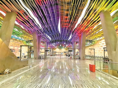 彩虹桥站站厅天花呈现七彩变幻的效果。