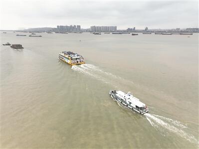 广州新港海事处“海巡09103”轮护航穗港码头“水上游”首航客船“广游19”轮。