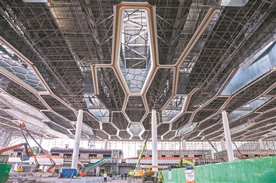增城区新塘镇,记者走进正在紧锣密鼓加紧建设的新塘站站房大厅,抬头望去,只见几名工人正在近20米的高空安装天花板异形膜结构吊顶,这是一种新型装饰材料透光膜,有着极好的透光性,并能配合灯光营造梦幻效果。新塘站吊顶有着28块这种长条透光膜,上面密密排列着不规则的小多边形,远远望去就像增城特产荔枝的外皮肌理。这正是新塘站的建筑设计灵感:“四望岗上摘挂绿,白水仙境迎客来”。