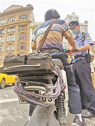 “我的车是登记上牌的,但后来号牌被撞掉后,我觉得问题不大就没管。”几分钟后,另一名男子骑行电动自行车经过路口时因未悬挂号牌被查。