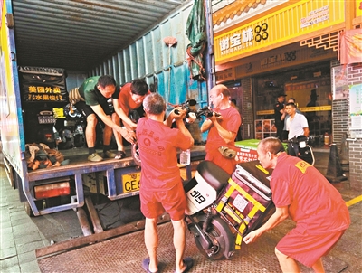 16日0时起,工作人员开始有序清理仍停放在村内的电单车,30多辆电动自行车清运车辆分片区参与清运工作。一旦装车完毕,这些车辆即刻启程,驶向万里汽配广场、鸿运汽配、月历城及其周边指定的清理存放点,将电动车卸下摆好。