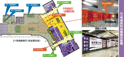 “改造过程中,员村站和天河公园站的部分区域将进行围蔽施工。”王利军介绍。记者从围蔽示意图中看到,员村站属于原二十一号线的区域均需围蔽,包括换乘通道、站厅站台以及A、E、F三个出入口;天河公园站则需要围蔽1和2站台,同时启用3和4站台作为二十一号线列车停靠和乘客上下车。