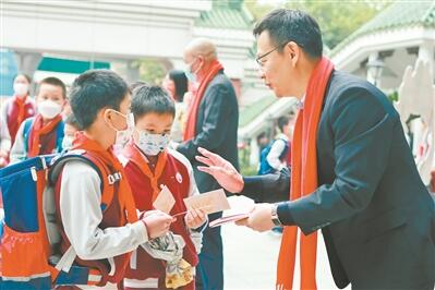 广州市第十六中学校本部的同学们一走进学校,就收到放有祝福语的开学“利是”,还有“红兔”“文曲星”“状元爷”等可爱的吉祥物给同学们送上了新年的福包和糖果。一声声问候,一张张笑脸,大家瞬间回归到熟悉而热闹的校园。