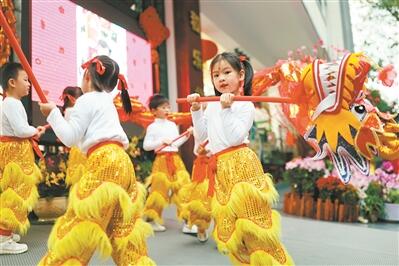 广东省育才幼儿院二院则为小朋友们准备了热闹的“广府庙会”活动。萌娃们穿上红色喜庆的衣服回到幼儿园,一下子就被各种摊位吸引了。不仅有敲锣打鼓、龙狮贺岁,大吉大利的桔子、甜蜜可口的糕点糖果,更有大“剪”宏兔、袋袋平安、击鼓送福等精彩活动,小朋友们有得吃有得玩,不哭不闹,高高兴兴地开始了新学期。