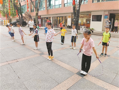 今年是广州市工人文化宫首次推出暑期托管服务,其尝试有效整合工人文化宫已有的场所和培训课程资源。记者看到,在体育锻炼课程中,孩子们能走出教室,来到工人文化宫一楼的空旷场地跳绳;舞蹈、非洲鼓、编程等课程以及观影活动可以直接利用工人文化宫已有的课程资源和场所;而在每周一次的红色研学活动中,孩子能直接走入越秀区的红色景点学习。