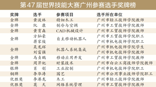 广州是中国技能军团的“主心骨”,在本届世赛中共有13名选手代表国家参加11个项目的比赛,夺得7金1银1铜2优胜奖,获金牌数占全省二分之一,占全国近五分之一,位列全国各城市首位,创历史佳绩。