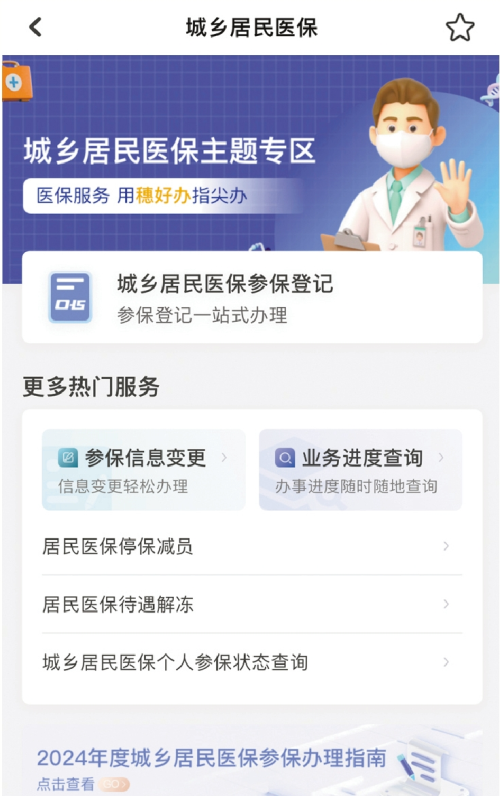 打开“穗好办”APP首页,在“热门服务”点击“城乡居民医保”,即可进入城乡居民医保主题专区。